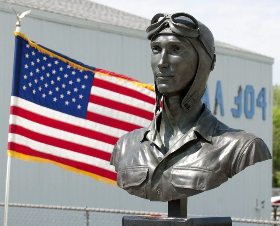 The bust of a fighter pilot was dedicated in front of more than 100 people noon Friday at the airport. The monument includes the bust and two stone pillars, one engraved with the John Magee poem "High Flight" and the other explaining who the monument was created for.